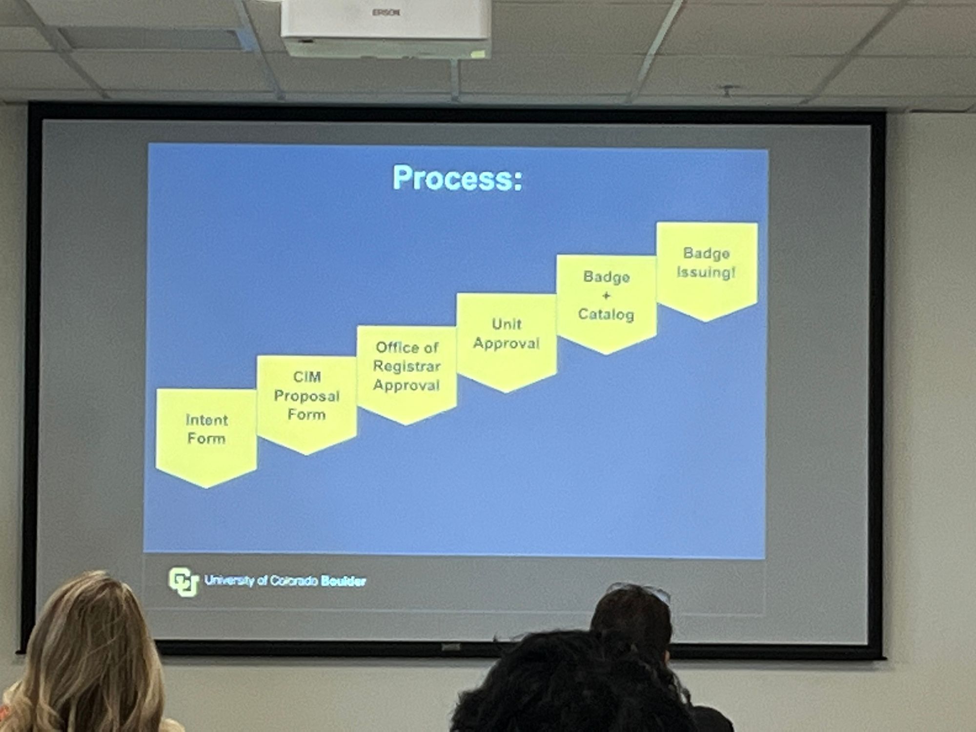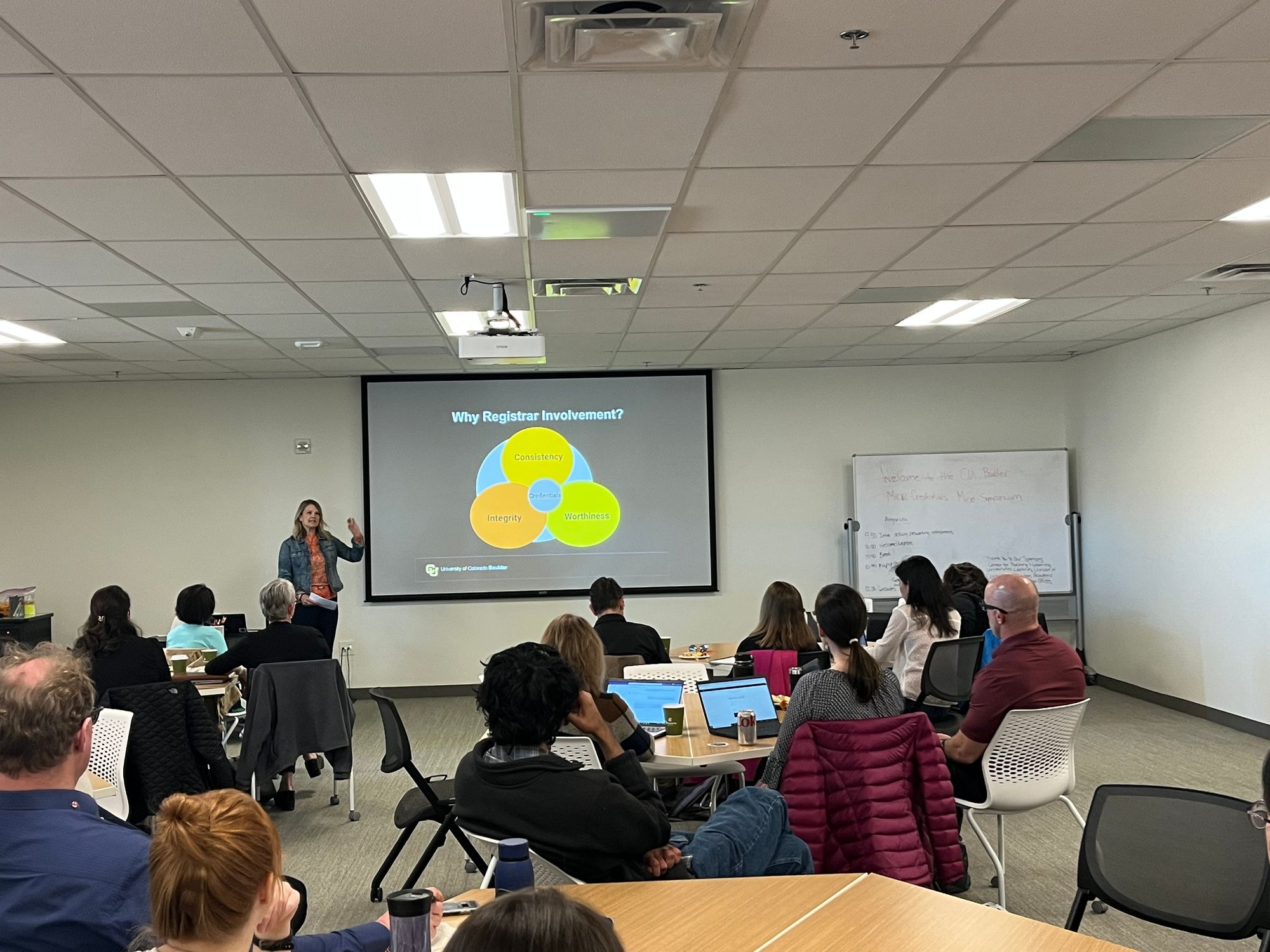 Today we are hosting a micro-credentials micro-summit at CU Boulder. Sponsored by the office of the registrar, the office of information technology, continuing education, academic and learning innovation, the university libraries, and our center for teaching & learning. This is a picture of our registrar Kristi Wold-McCormick giving the opening segment.